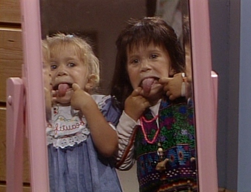 This was typically utilized for story lines involving an evil twin, an angel/devil on the shoulder scenario, or that EPIC episode where Michelle fell off her horse and forgot her WHOLE FAMILY. In the case up above, this is when the girls play long lost cousins, one from Greece and the other from San Francisco. They are shocked at how much they look alike and lets just say some pretty kooky shenanigans ensued…
